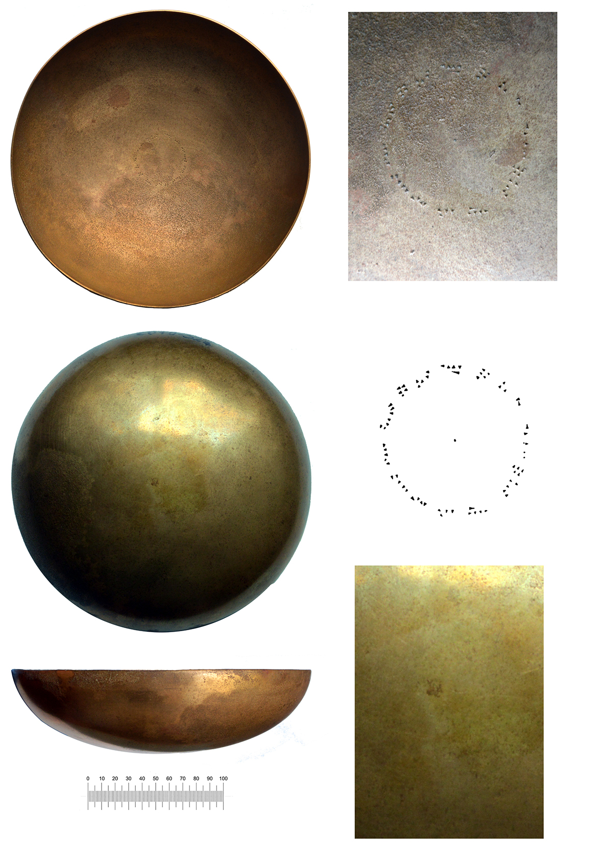 The bowls considered in this paper are hemispherical shallow bowls with a continuous profile, an indistinct rim, and a concave bottom in continuity with the profile. They fall into a standardised morphology comparable with all the other specimens of Urartian inscribed metal bowls (see Seidl 2004, 55‑9). The unfinished bowl (A) weighs 305 grammes and has a diameter of 18.9‑19.2 cm, a thickness of 0.1 cm, and a height of between 5.1‑5.6 cm. The other one (B) weighs 456 grammes and has a diameter of 19.2 cm, a thickness of 0.2 cm, and a height of between 5‑5.9 cm. The inscriptions are placed at the centre of the internal surface of the bowls and don’t have any iconographic apparatus, as is usual for Minua’s bowls (see Seidl 2004, 24‑5). The inscriptions follow a circular shape traced with the use of the compass, which can be reconstructed thanks to the needle impression at the centre of the bottom in both bowls. Both inscriptions present a counterclockwise development.