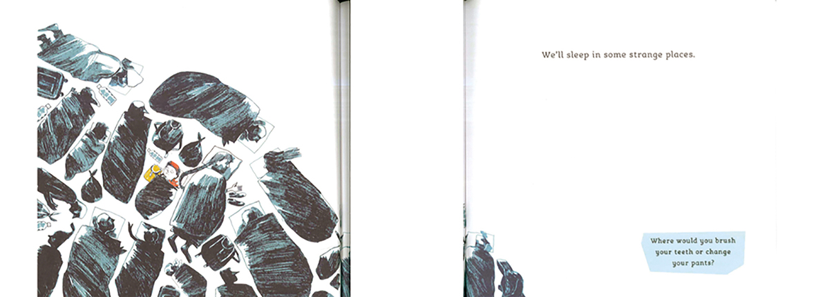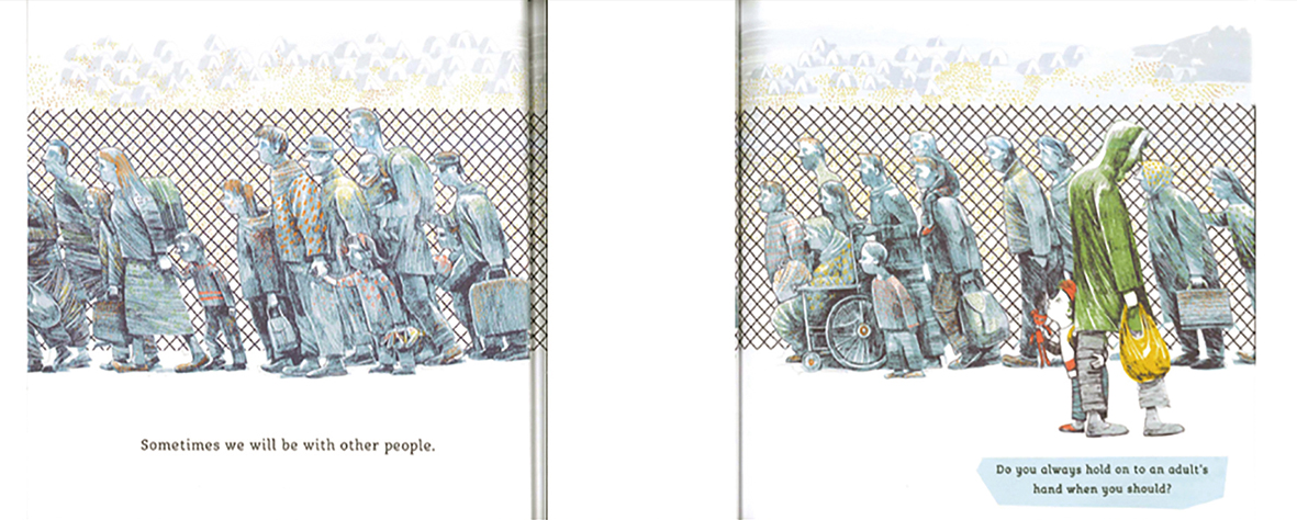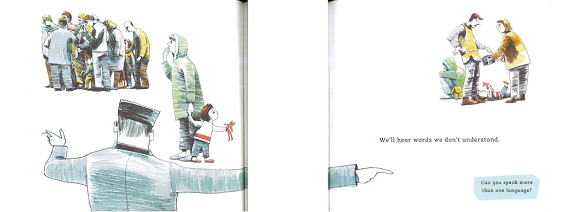 The focus on the young child holding hands with the mother is a recurring theme in picture books that depict migrations. Generally, the figure of the father is absent, presumably having migrated earlier. The journey to the new destination brings the protagonists into contact with places and individuals with whom they share stops, movements, and times of waiting [figs 4-5].