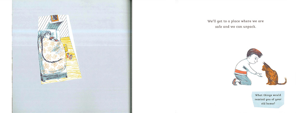 The same thematic sequence characterizes the narrative structure of My Two Blankets. The story opens with the same narrative pattern: leaving the place of origin due to an ongoing war, seeking safety (“We came to this country to be safe”, 3). The effects of uprooting are described using the same narrative formulas as in My Name Is Not Refugee (“everything was strange”/“The people were strange”, 3), defining the place, the people, the food, the animals, the plants, and even the wind as disorienting. The solitude and linguistic estrangement (“Nobody spoke like I did”, 5) are vividly described through the metaphor of a liquid cascade of strange sounds experienced by the protagonist (“when I went out, it was like a waterfall of strange sounds”, 6), which is later emphasised through a visual metaphor in the representation of a tree with roots sinking into a small boat that is reminiscent of the ‘boats of the sea’ used by seafarers to reach the shores of the Mediterranean. Similarly, the theme of a sense of belonging to the place of origin is embodied not only in the construction of a relationship with the new language, but in keeping the past alive through the connection with an old blanket and the old language that provides security (“When I was at home, I wrapped myself in a blanket of my own words and sounds”, 8). The theme of friendship becomes a bridge that unites and assists (“Every time I met the girl, she brought more words. Some of the words were hard. Some of them were easy”, 21) in embracing the new language, signs, and sounds in a syncretic manner (“my new blanket grew just as warm and soft and comfortable as my old blanket”, 28).