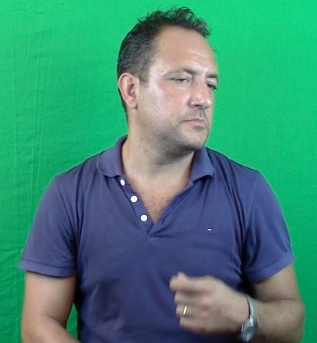 The most remarkable difference between shouting and whispering is the extension of the signing space: the former makes use of larger space, the latter of smaller space. The two screenshots below show the same sign (late) articulated in the two registers: in shouting (a), the dominant hand is completely extended in the signing space in front of the signer’s torso; while in whispering (b), the dominant hand articulates the sign in a small area in front of the signer’s lower torso.